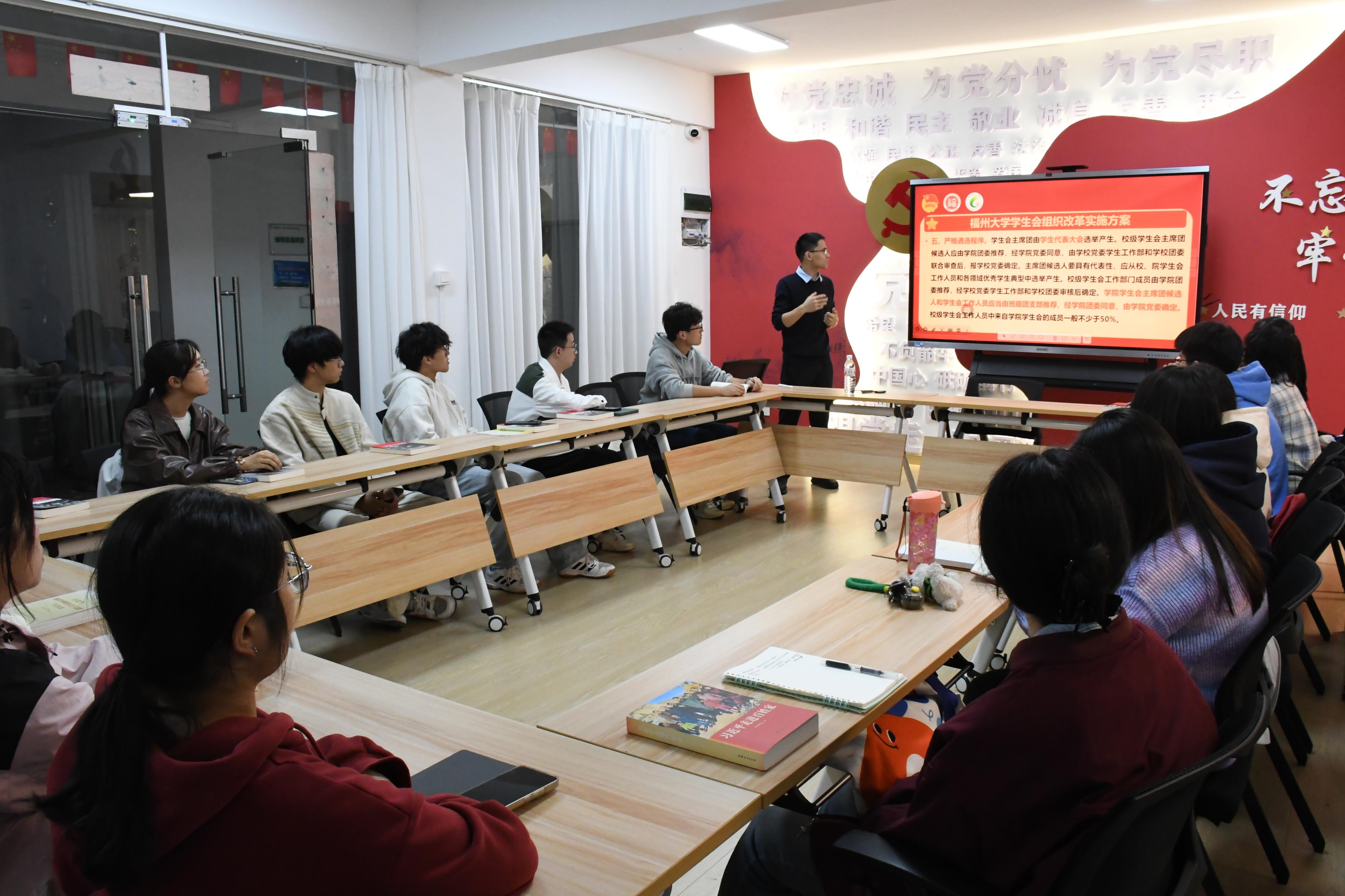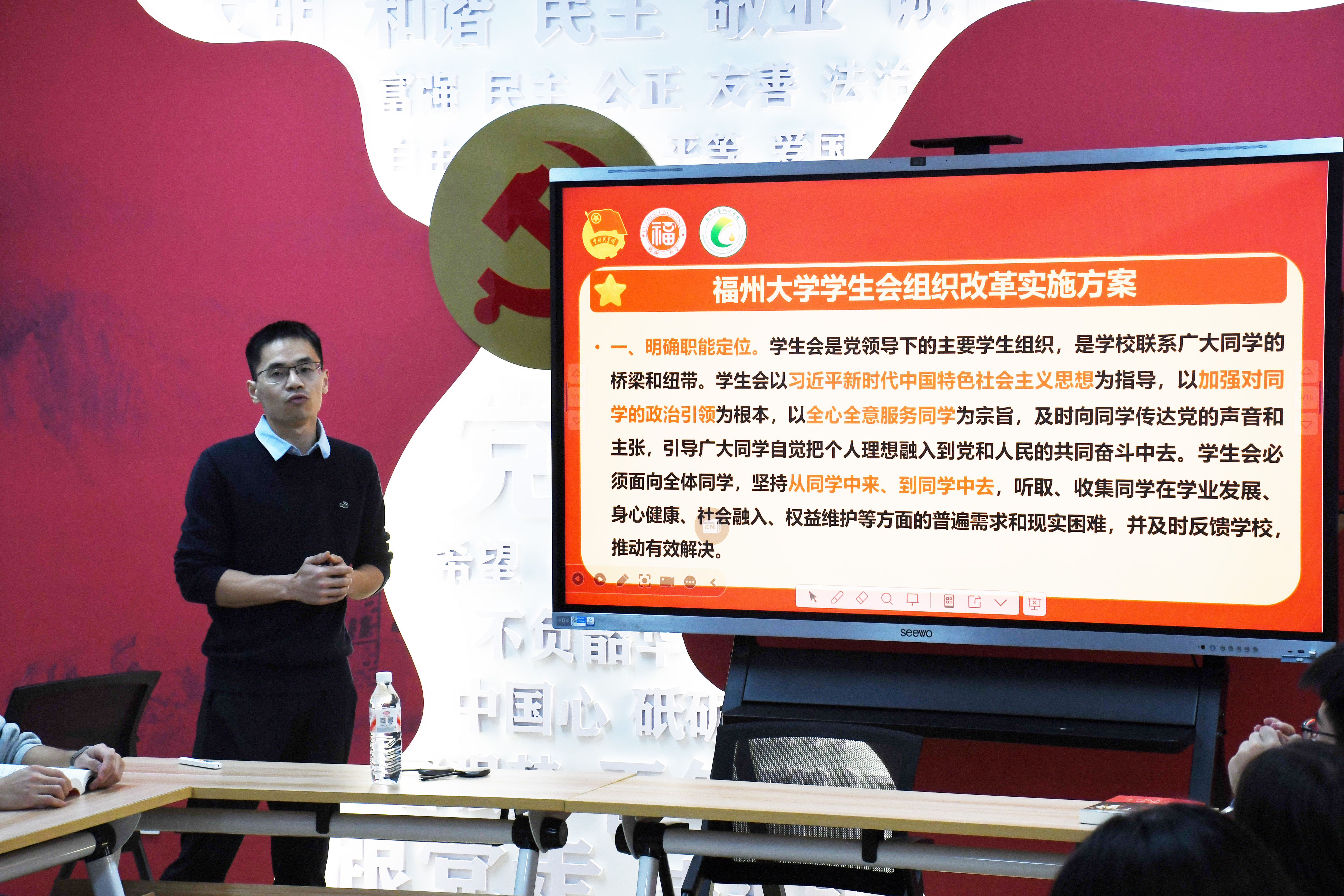 学生会组织改革实施方案》,阐明了学生会组织的职能所在和重担所托,让在场学生骨干更加坚定在工作中以加强对同学的政治引领为根本,以全心全意服务同学为宗旨,及时向同学传达党的声音和主张,及时听取、收集同学在学业发展、身心健康、社会融入、权益维护等方面的普遍需求和现实困难,并及时反馈学校,推动有效解决。
