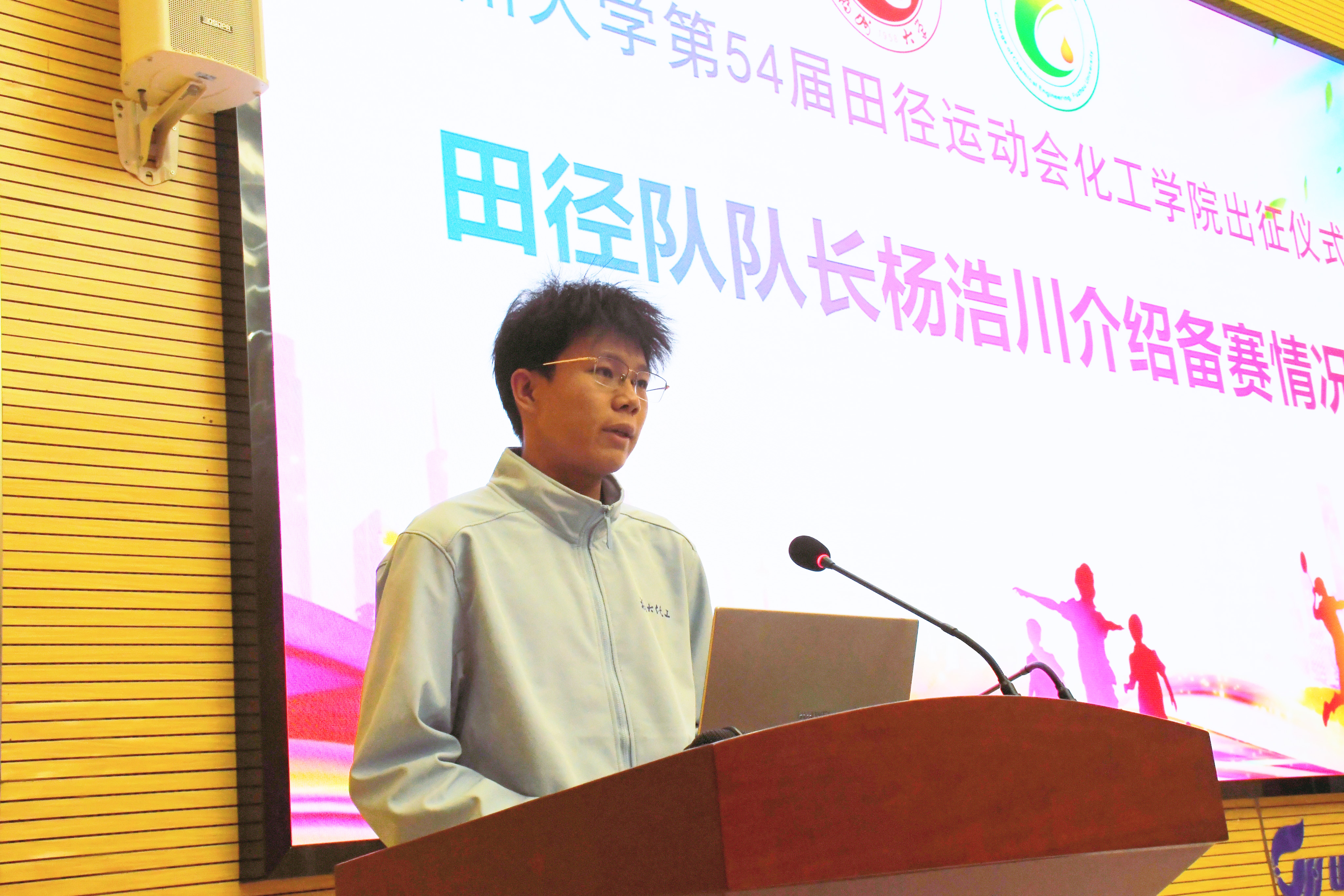 田径队队长杨浩川介绍了备赛情况。他提到,自选拔结束以来,全体运动员历经一个月的系统训练,过程虽充满艰辛,但训练成效显著,大家的进步有目共睹。杨浩川也结合自身经验特别强调,所有运动员在赛前务必以健康与安全为首要原则,避免过度训练,科学安排训练内容。最后,他号召全体运动员在赛场上全力以赴,力争为化工学院赢得荣誉。