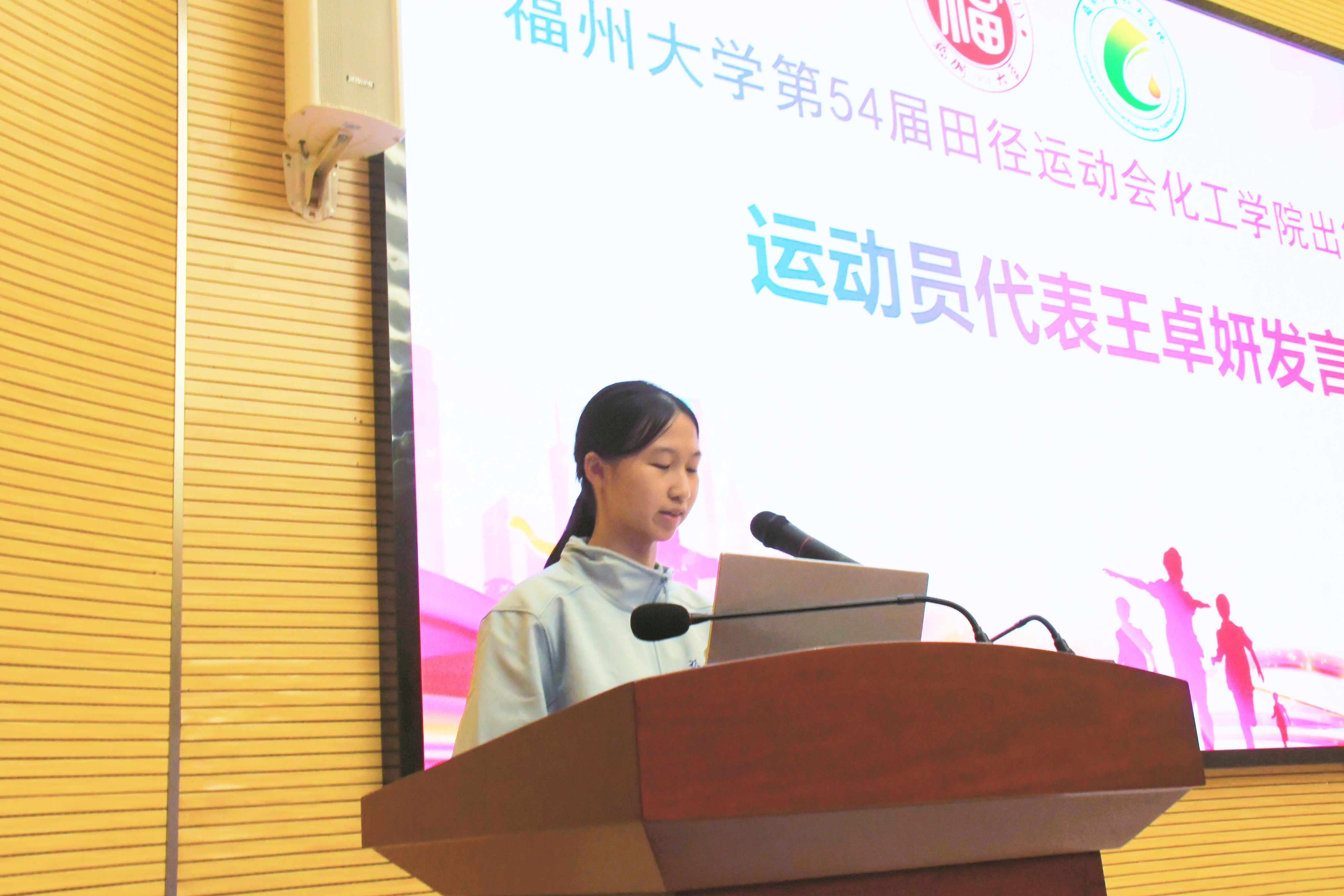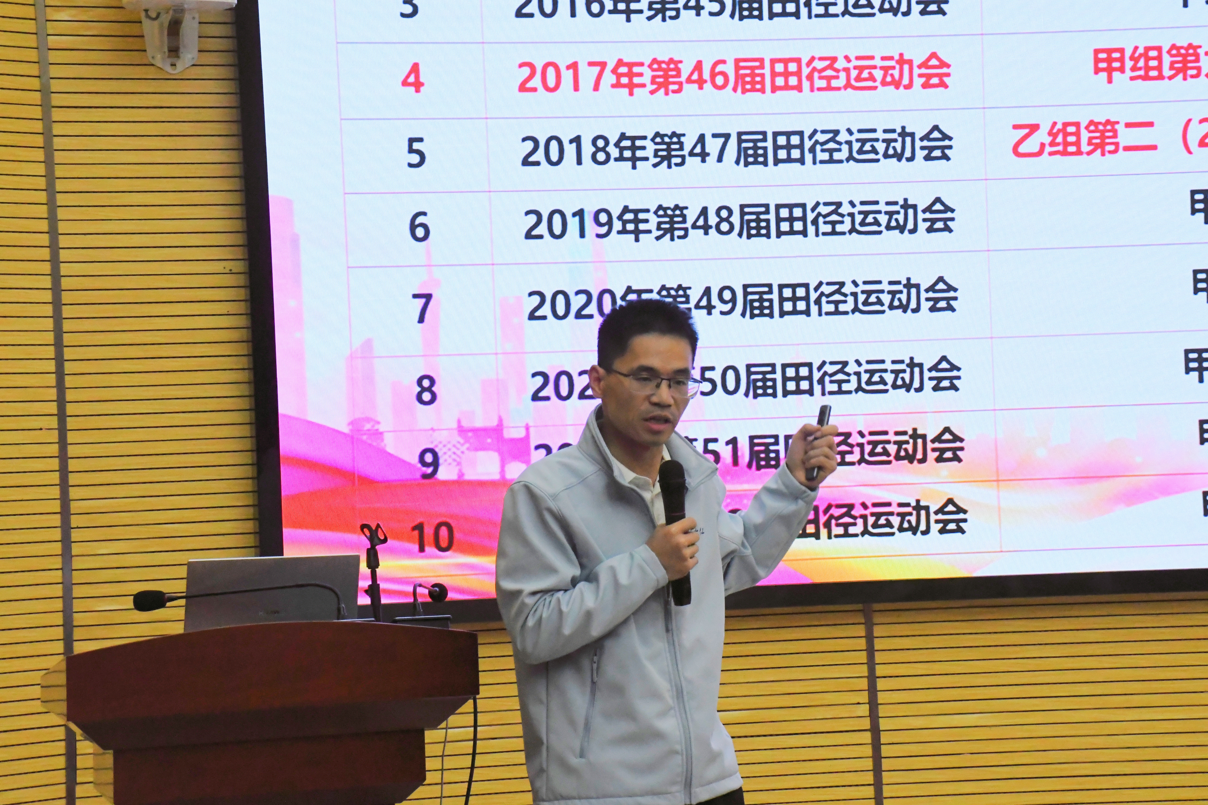 何杰老师回顾了过去十年学院在运动会的成绩并发布新的学院男女组个人得分榜,希望全体运动员能够以得分榜上的优秀运动员为榜样,努力训练,敢于突破,将“青春化工人,为荣誉而战”的精神代代传递。同时何杰老师结合自己学生时代多年的参赛经历和在田径场的成长轨迹,勉励大家调整好状态,用饱满的热情,昂扬的心态,在赛场上全力拼搏,续写化工辉煌。