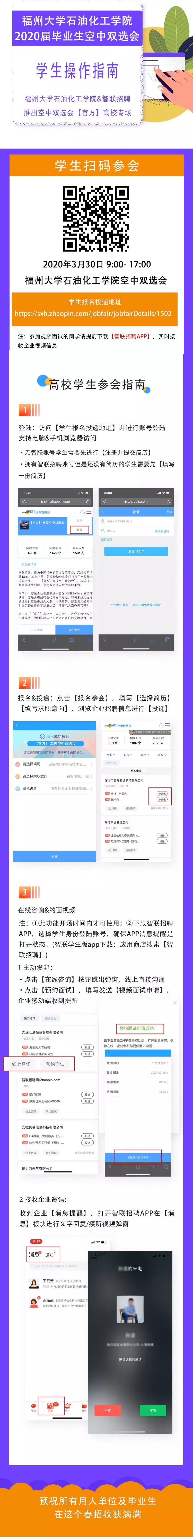 注:双选会开始当天,需要企业视频面试的同学,需要提前下载智联招聘APP,通过手机APP端才可面试。
