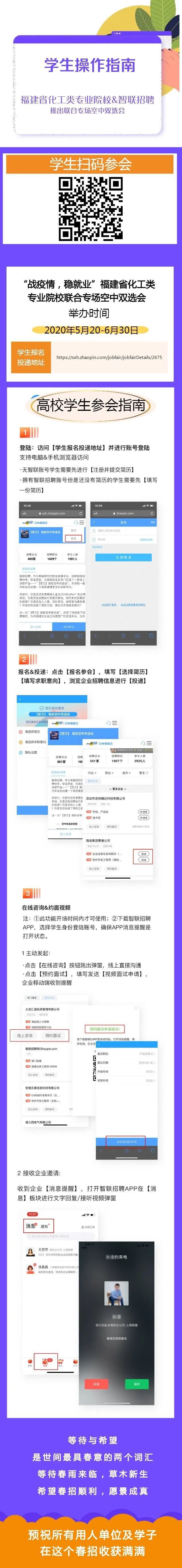 石油化工学院、华侨大学化工学院、福建师范大学化学与材料学院、福建工程学院生态环境与城市建设学院、福建农林大学材料学院、闽南师范大学化学化工与环境学院、闽江学院海洋学院、泉州师范学院化工与材料学院联合智联招聘特在新型冠状病毒感染肺炎疫情期间举办”福建省化工类专业院校联合专场空中双选会。此次空中双选会为公益性质,不收取企业任何费用,诚邀贵单位报名参加: