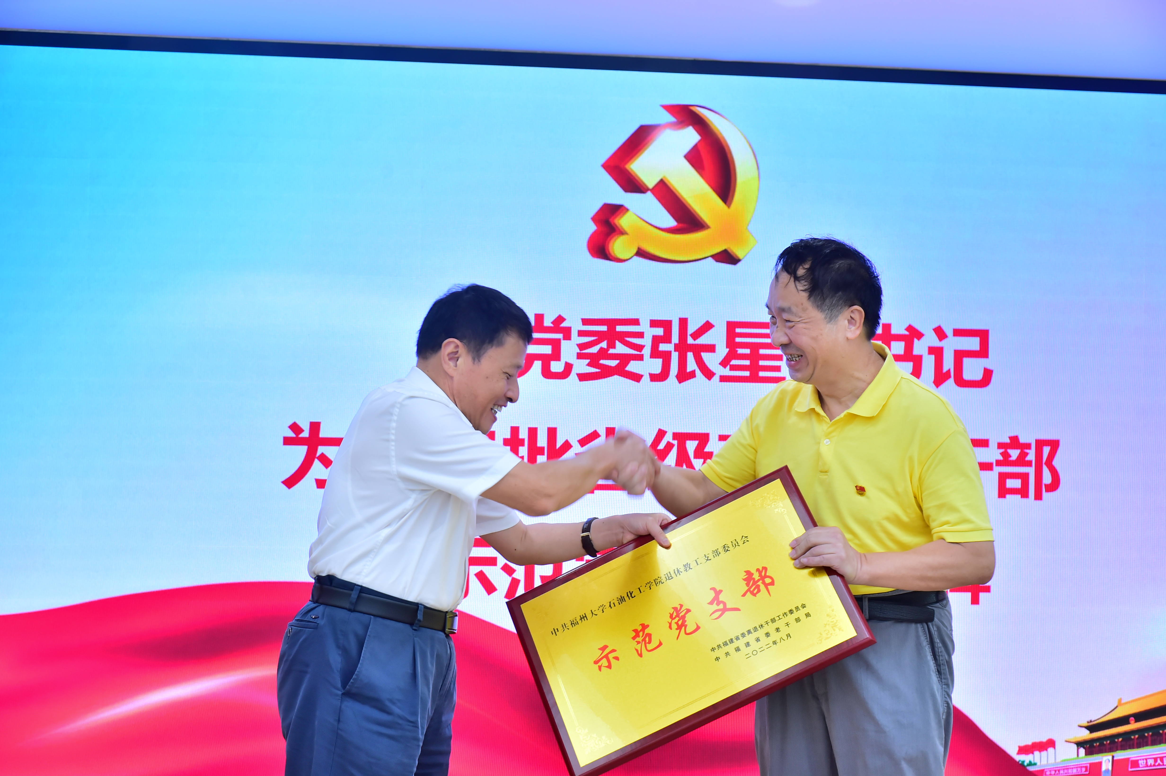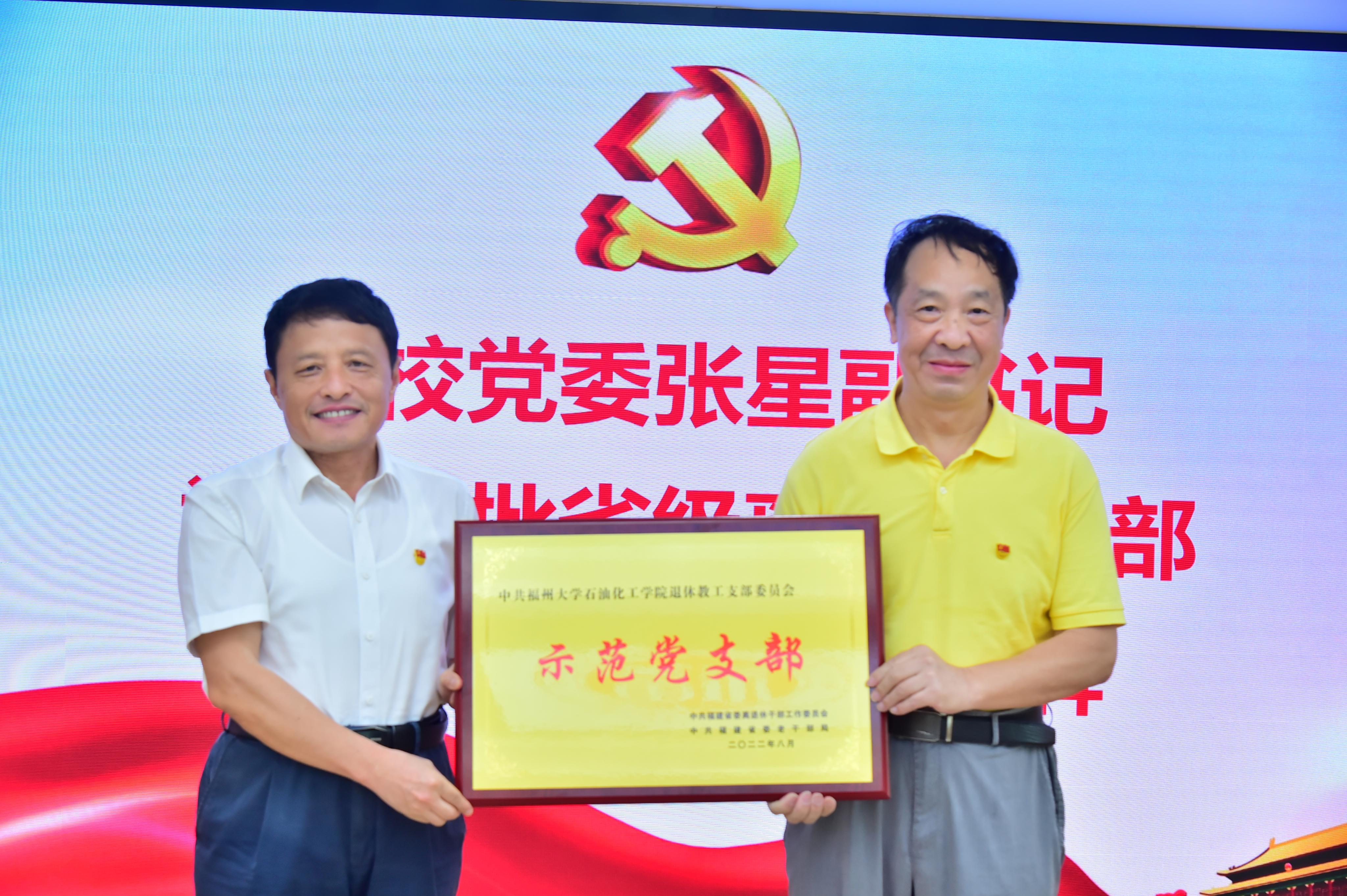 第三批省级离退休干部“示范党支部”授牌仪式在怡山校区化肥催化国家工程中心报告厅举行。校党委张星副书记,组织部、离退休工作办公室、石油化工学院、经济与管理学院、马克思主义学院党委负责人和3个省级离退休干部“示范党支部”老同志代表出席了授牌仪式。