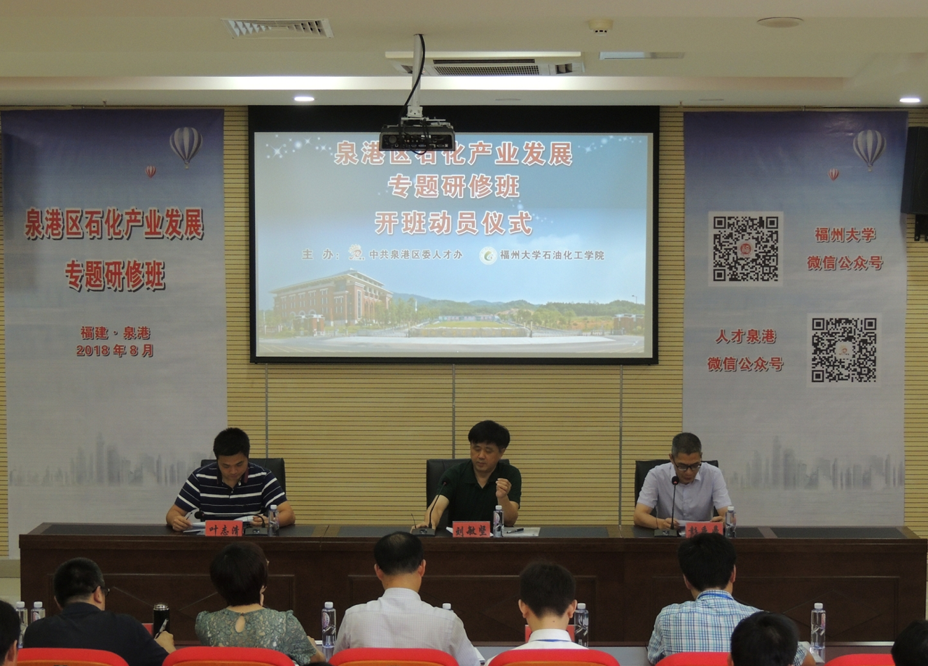 石油化工学院和中共泉港区委人才办联合主办泉港区石化产业发展专题研修班。本次研修班为期三天,开班动员仪式于2018年8月29日早上在学院图书馆举行。