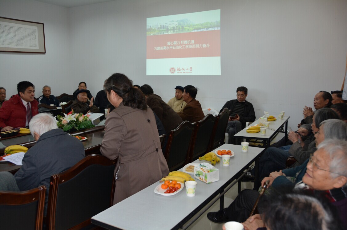 羊年伊始,万象更新!冬日暖阳,乐意融融! 22日上午,学院在怡山校区退休教工活动中心召开退休教工新年茶话会,院党委叶志清书记出席会议,他简要介绍了2014年学院工作的突出亮点和2015年学院工作计划,并代表学院为退休教工们送上了新年的美好祝福。50余位退休教工与学院党政领导济济一堂,共话美好晚年生活,同议学院科学发展。 恭祝全体退休教工:健康长寿,阖家幸福,新年快乐!