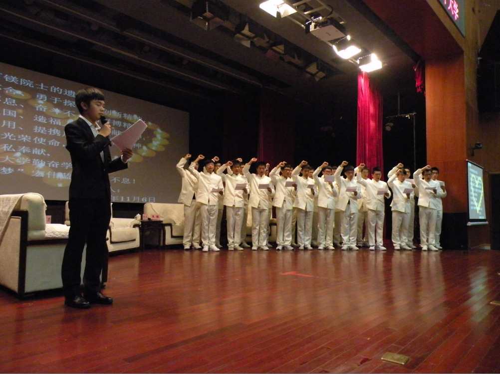 讲坛尾声,全体同学起立,庄重宣誓:“我将继承魏可镁院士的遗志,学习他锲而不舍、勇于创新的探索精神,学习他生命不息、奋斗不止的拼搏精神,学习他热爱祖国、造福人民的奉献精神,学习他唯才是用、提携后学的人梯精神,传承福大人的光荣使命,勇于拼搏,无私奉献,为建设高水平大学勤奋学习,为实现“中国梦”宏伟蓝图奋斗不息!”。至此,讲坛圆满结束。