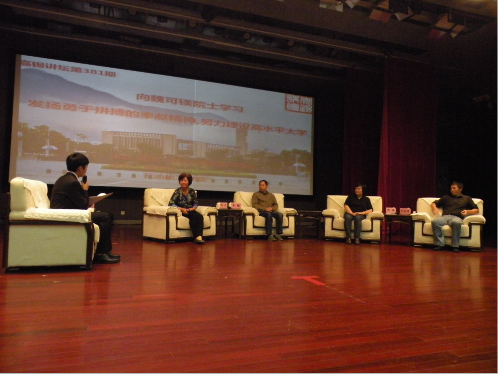 讲坛开始前,屏幕播放了福州电视台以纪念魏可镁院士为专题的《关注》影片,到场同学无不深切感受到魏可镁院士作为一名优秀科技工作者、优秀共产党员的品质与精神。讲坛伊始,校党委副书记陈少平研究员为活动致词,并沉重地表达了化学化工界、教育界对魏可镁院士离世的深切哀悼。而后播放的相关资料,使在场师生对魏老先生的个人生平有所体悟。紧接着,魏可镁院士生前的同事、学生,即今天的嘉宾同时上台,在主持人的问题中道出了对魏老先生照顾后辈,无私奉献等优秀品格的回忆。