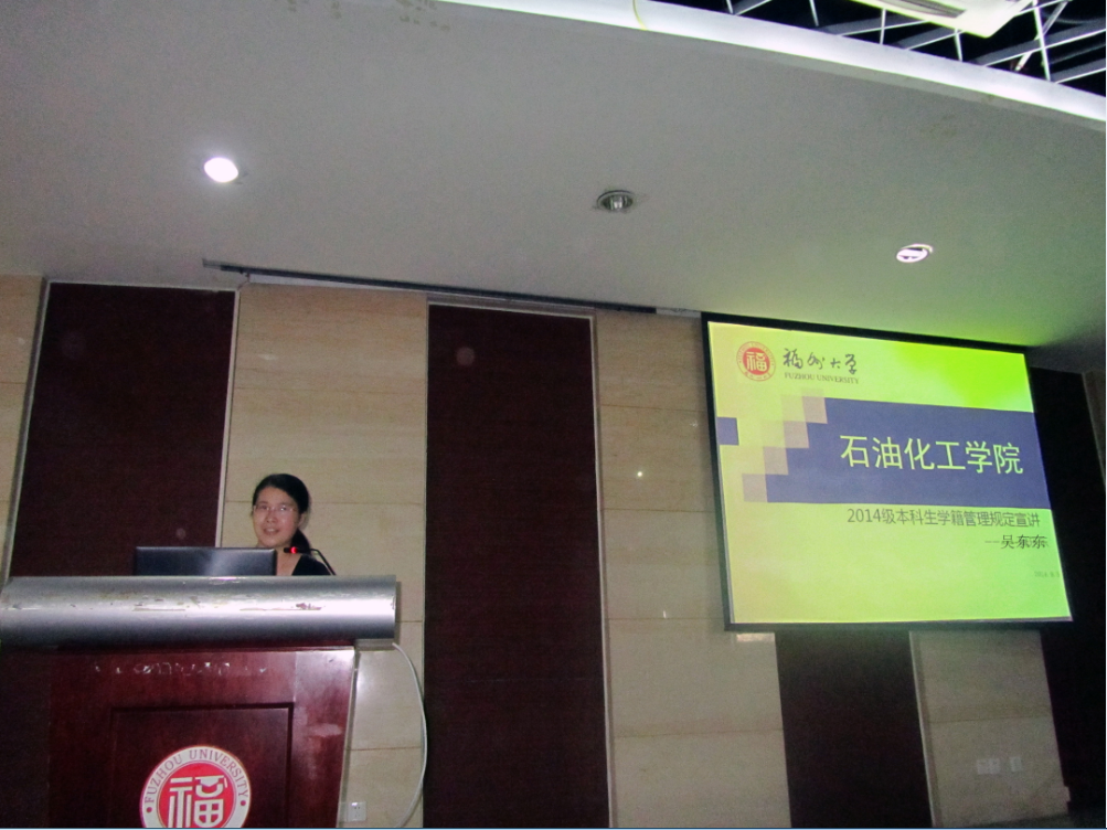 9月5日下午两点三十分,由石油化工学院教学办组织的《学生手册》宣讲活动和学院组织的适应性教育系列活动之朋辈分享《新生引导手册》活动在大学生素质拓展中心二楼报告厅举行。院教学办吴东东老师、院团委书记兼14级新生辅导员蒋林娟老师出席本次会议。