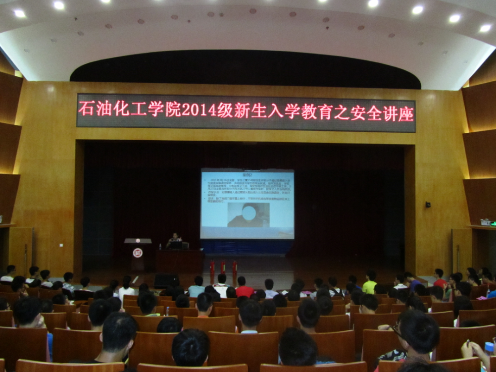 石油化工学院于9月6日晚上,邀请到校保卫部唐春林老师为刚刚步入大学校园的2014级石油化工学院的新生开展了以“安全在我心”为主题的入学安全教育讲座。石油化工学院团委书记兼2014级新生辅导员蒋林娟出席并主持本次讲座。