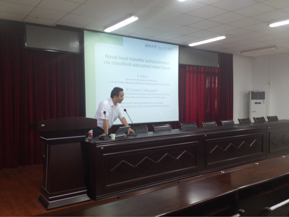 Nakayama教授开讲前以流利的英文介绍了自己的家乡,并且以诙谐幽默的谈吐为本次讲座带来了轻松的气氛。从“泡沫金属”与“纳美流体”的介绍说起,逐渐深入的引出两者融合的可能性,“强化传热”的原理解说更是令学生们茅塞顿开。由浅到深的引导式解说在最后以学生们热烈的掌声中得到了完美的结束。