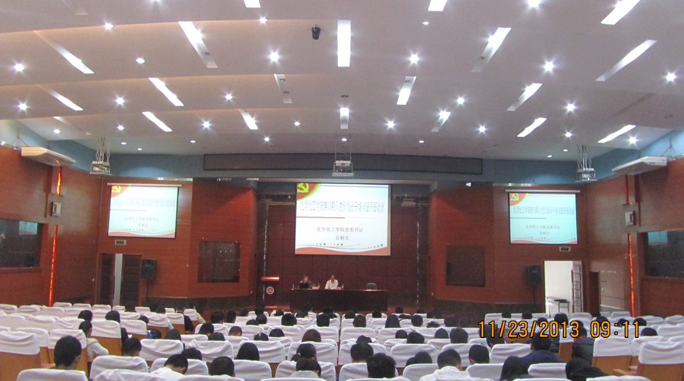 化学化工学院分党校第十九期入党积极分子培训班在嘉锡楼报告厅开班。出席本次开班仪式的有院党委石炳文书记,党委施卫华副书记,10级辅导员朱振宁,11级辅导员华琴,及学院入党积极分子90余人。