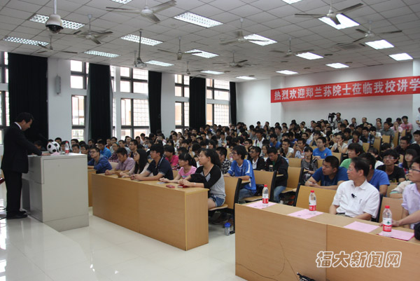 55周年华诞,中国科学院院士、973计划项目首席科学家、教育部化学专业教学指导分委员会主任、全国政协常委、福建省政协副主席、民盟中央副主席、厦门大学教授郑兰荪院士应邀出席校庆55周年“院士论坛”,以授课的形式为我校师生带来一堂题为《物质结构与原子团簇》的精彩教学示范课。250多位青年教师和学生到场聆听,教室座无虚席,连过道上都坐满了学生,气氛十分热烈。论坛由化学化工学院党委石炳文书记主持。