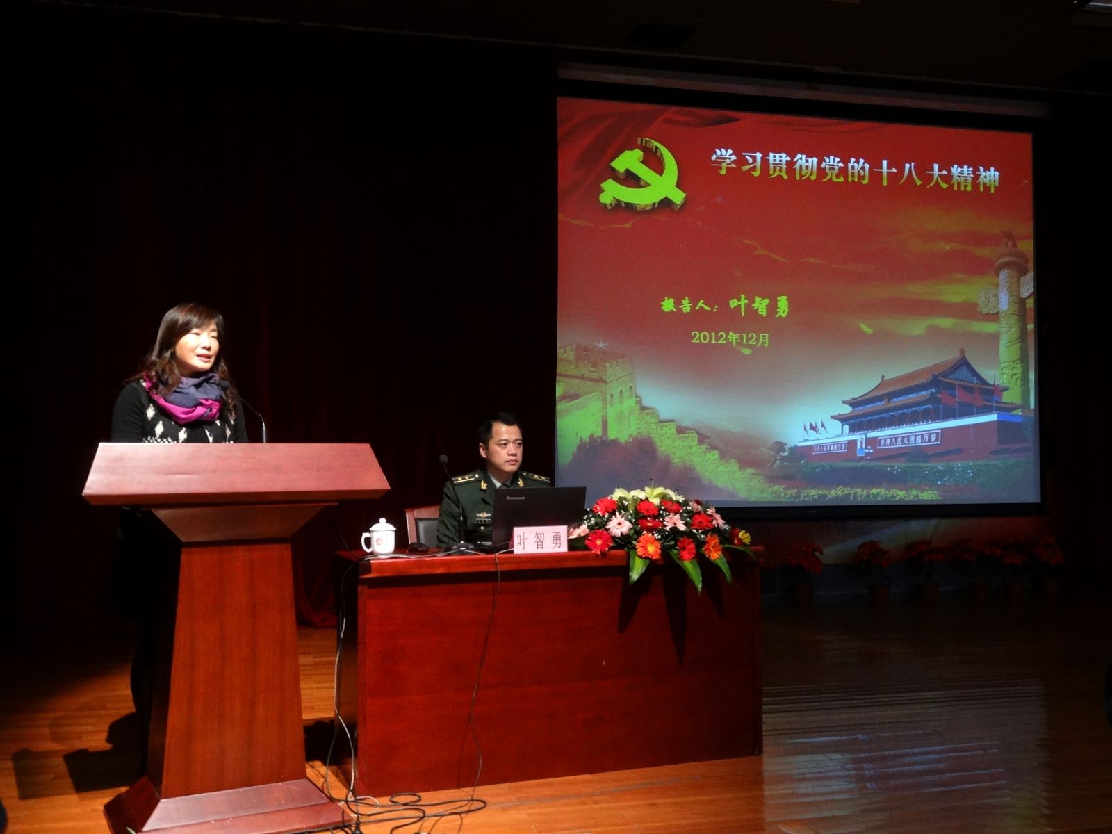12月6日下午,化学化工学院学习贯彻党的十八大精神动员会在明德厅举行。院党委倪朝霞书记到会进行部署。动员会后,应邀来校的化学化工学院校友、全国十八大党代表叶智勇为学院师生作了十八大精神宣讲。