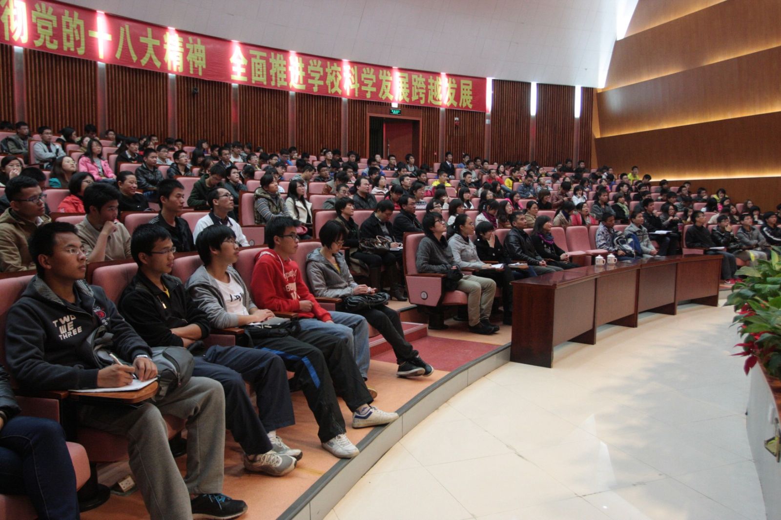 叶智勇校友首先以一个亲历者向师生们详细介绍了十八大的大会盛况,着重解读了大会的主题、特点,以及我省十八代表团的工作情况。随后,他从“深刻领会党的十八大主题”、“深刻领会五年辉煌成就和十年伟大实践”、“深刻领会科学发展观的历史地位”、“深刻领会中国特色社会主义的丰富内涵”、“深刻领会全面建成小康社会和全面深化改革开放的目标”、“深刻领会总体布局和重大部署”、“深刻领会全面提高党的科学化水平的新要求”七方面为我校师生全面解读十八大精神。他指出,十八大报告高屋建瓴,总揽全局、内涵丰富、富于创新,充分体现了解放思想、实事求是、与时俱进、求真务实的精神,创造性地提出了一系列新思想、新观点、新目标、新举措,具有很强的理论性、思想性、战略性和指导性。最后,叶智勇校友结合自身工作情况谈了学习十八大精神的感受。他指出,十八大报告博大精深,有理论创新,有实践基础,有全局视野,有战略谋划,为我们今后工作指明了方向,同时他也强调,宏伟蓝图固然美好,道路却依然异常艰辛和困难,需要我们共同努力去创造。他以幽默风趣的语言和视频生动形象地展示自己的成长经历,结合化学化工专业勉励学弟学妹们努力学好科学本领,吃苦耐劳,努力为国家的繁荣发展做出贡献。