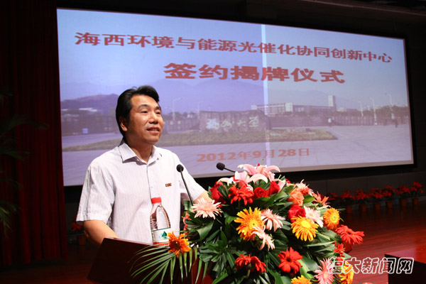 9月28日下午,由我校牵头成立的海西环境与能源光催化协同创新中心在图书馆博学厅举行成立揭牌仪式,陈桦副省长出席成立仪式,省政府李强副秘书长、教育厅鞠维强厅长、省发改委高技术处黄建勇处长、教育厅科技处陈明庆处长、省科技厅发展计划处吴颖调研员、石油化工科学研究院工程院舒兴田院士、中科院福建物构所所长科学院洪茂椿院士、北京化工大学校长工程院谭天伟院士、中科院化学所赵进才院士等中心部分工程技术委员会、管委会委员以及我校全体校领导出席了大会。陈桦副省长和总装备部科技委曹保榆将军、石油化工科学研究院舒兴田院士、我校校长付贤智院士共同为中心揭牌。成立仪式由校党委陈永正书记主持。