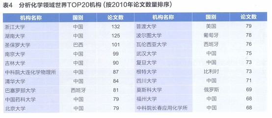 根据该报告中评估结果显示,我校分析化学学科在分析化学领域世界TOP20机构按2010年论文数量排序位居世界第19位(见以下图表)。这一国家层面上的评估结果充分显示我校分析化学二级学科科研竞争力已进入到世界先进水平行列。