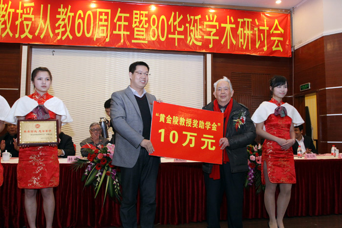 和化学化工学院的发展,为激励年轻学子刻苦学习,研讨会上,特拿出自己平时节俭的10万元积蓄设立“黄金陵教授奖助学金”,主要用于资助化学化工学院品学兼优但家庭经济困难的本科生和研究生。多年来,黄金陵教授一直难忘恩师对自己的教导,将恩师卢嘉锡先生当年为自己修改的论文稿长期保留作为认真学习的材料。这次会上,为了表达对恩师的感念之情,将一篇原稿赠送给卢嘉锡科学教育基金会。