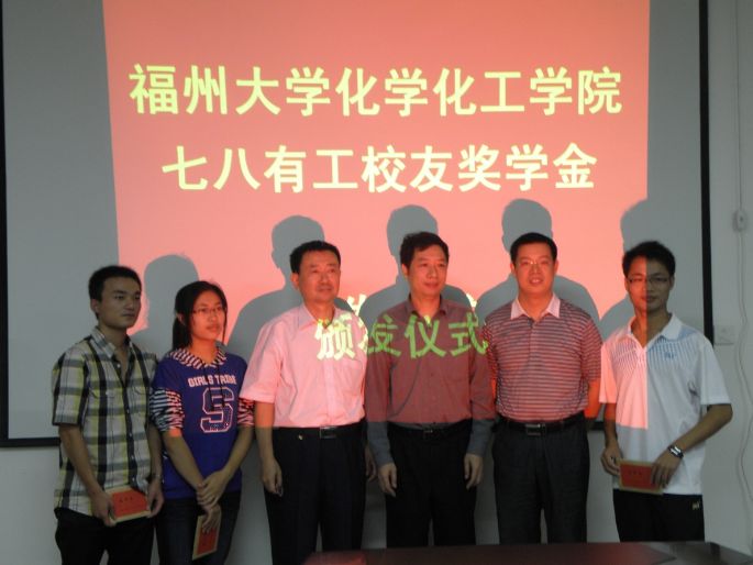 2011年11月5日上午,“感恩博爱,励志奖学”的“78有工”校友奖助金颁发仪式在嘉锡楼415举行。,“七八有工”校友代表彭超、沙纪辉校友,院党委副书记施卫华、辅导员刘旭莹、朱振宁及获奖学生参加了本次颁发仪式。
