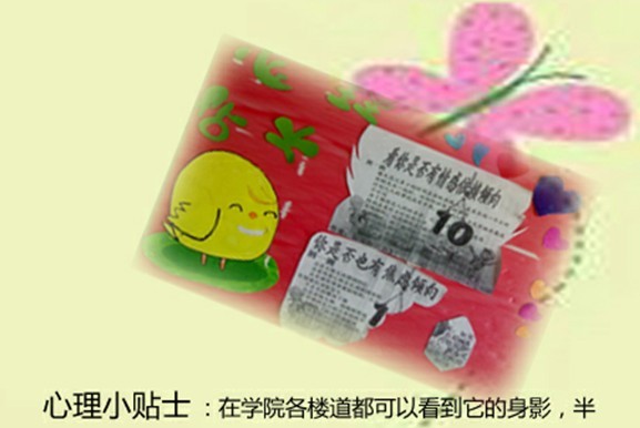 其中包括心理小游戏、心理小故事、和心理测试等心理方面知识,并且其中的内容及时更新。在学院内营造一个良好的心理文化氛围。