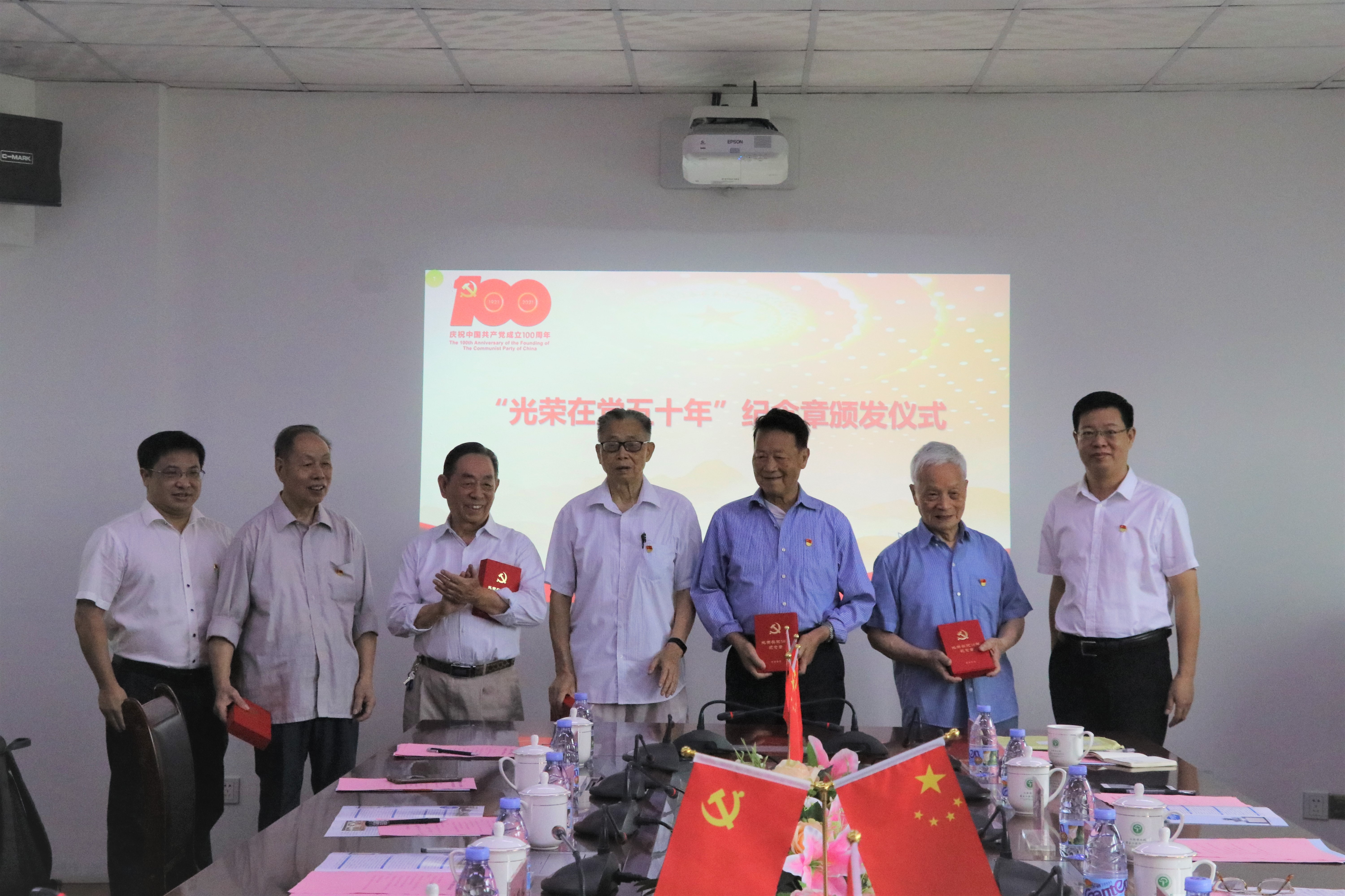在怡山校区工催中心会议室隆重举行“光荣在党50年”纪念章颁发仪式暨庆祝建党100周年主题党日活动。出席本次主题党日活动的有院党委施卫华书记、院长江莉龙研究员、院党委岳志强副书记、获纪念章的老党员以及师生党员代表。