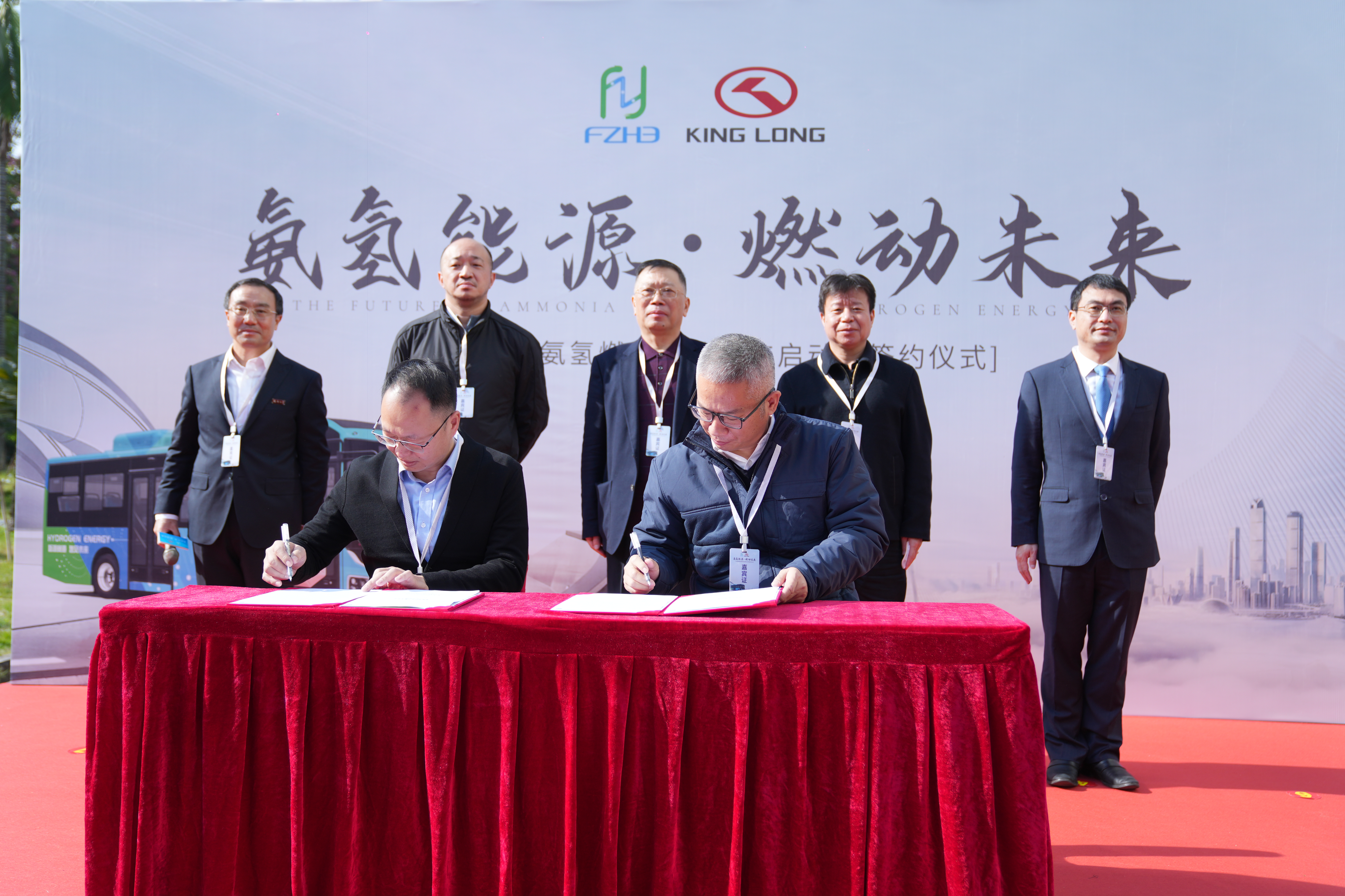 启动仪式上,陈国龙书记、福建省科技厅副厅长叶碧海、福建省汽车工业集团有限公司副总经理陈锋、紫金矿业集团副总裁龙翼分别致辞。领导们在致辞中指出,各方本着合作共赢的理念,发挥政府、企业和高校各自的品牌、资源和技术优势,聚焦氨氢能源在交通领域燃料电池汽车的商业化推广应用,对加速国内新一代“零碳”能源产业发展和保障国家能源安全具有重要意义。随后,在与会领导、嘉宾的见证下,福大紫金氢能科技股份有限公司和厦门金龙联合汽车工业有限公司签订了氨氢能源客车新车型开发合作协议。最后,陈国龙书记宣布客车正式启动。