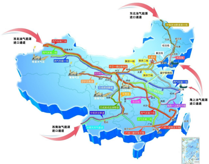 国家能源战略通道及主干管网示意图