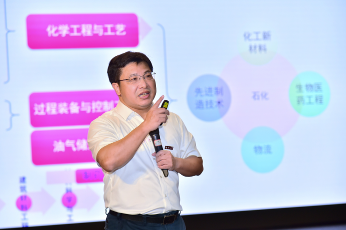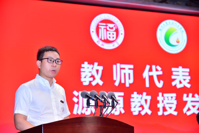 教师代表岳源源教授则代表学院全体教师对新同学们的到来表示欢迎与关心。他从“奋斗者志在追梦圆梦”、“奋斗者贵在持续学习”、“奋斗者贵在笃行不怠”三个方面勉励同学们要练就过硬本领,求得真才实学,在石化这个大大的花园里种下梦想的种子,开出理想的花朵!
