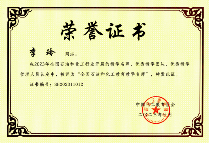 李玲教授荣获“全国石油和化工教育教学名师”称号,91吃瓜