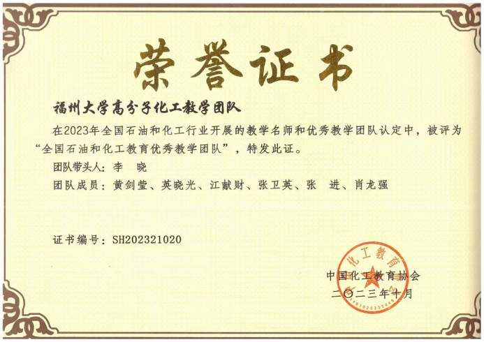 优秀基层教学组织”,2023年被授予“全国石油和化工教育优秀教学团队”荣誉称号。