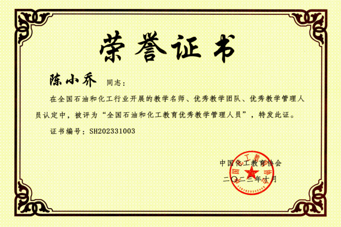 陈小乔老师荣获“全国石油和化工教育优秀教学管理人员”。