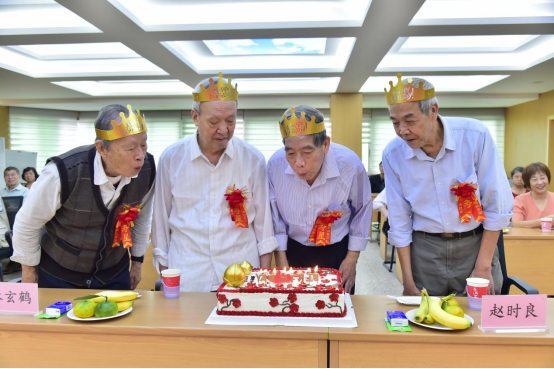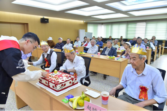 随后,与会领导为今年满90、85、80、75、70周岁的寿星祝寿。党员志愿者们推出祝寿蛋糕,伴随着欢快的生日歌,志愿者将蛋糕分发给老教师们,全场教职工共同分享此刻的喜悦与温馨。祝愿寿星们福如东海,寿比南山,祝愿学院离退休的老教师们身体健康、福寿延年。