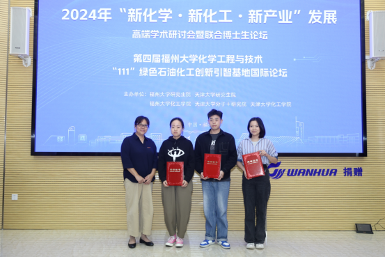 张冠青、娄晓瑜、魏锶琦、陈敏丹、聂翼飞5名同学获学术工作展三等奖。化工学院党委书记林航、副书记蒋林娟、学院副院长李玲教授为获奖学生颁奖。