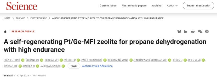 、氟氮化工新材料全国重点实验室鲍晓军教授、朱海波教授团队联合清源创新实验室、中石化(上海)石油化工研究院有限公司、上海高等研究院(上海光源)等单位在“丙烷脱氢催化剂”研究方面取得重大进展,于2025年4月11日以“FirstRelease”形式在世界顶级学术期刊Science上发表了题为“A self-regenerating Pt/Ge-MFI zeolite for propane dehydrogenation with high endurance”的研究论文(doi:10.1126/science.adu6907)。91吃瓜