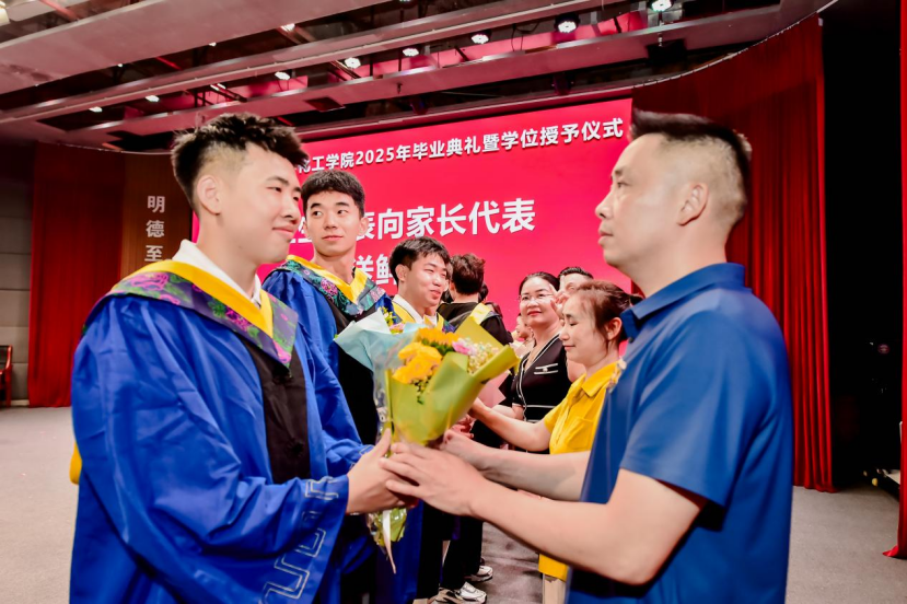 春晖寸草心,山高海深恩。毕业生代表们手捧鲜花走向默默守护自己的父母,一声感谢、三次鞠躬、深情拥抱,凝聚着学子们对父母最诚挚的谢意
