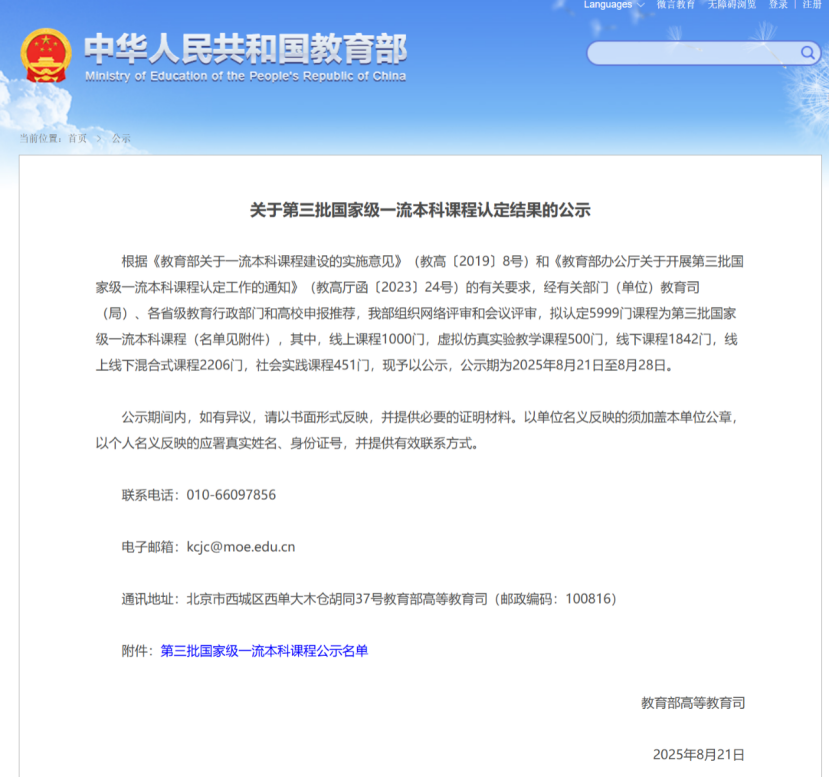 近日,教育部高等教育司发布了《关于第三批国家级一流本科课程认定结果的公示》,91吃瓜