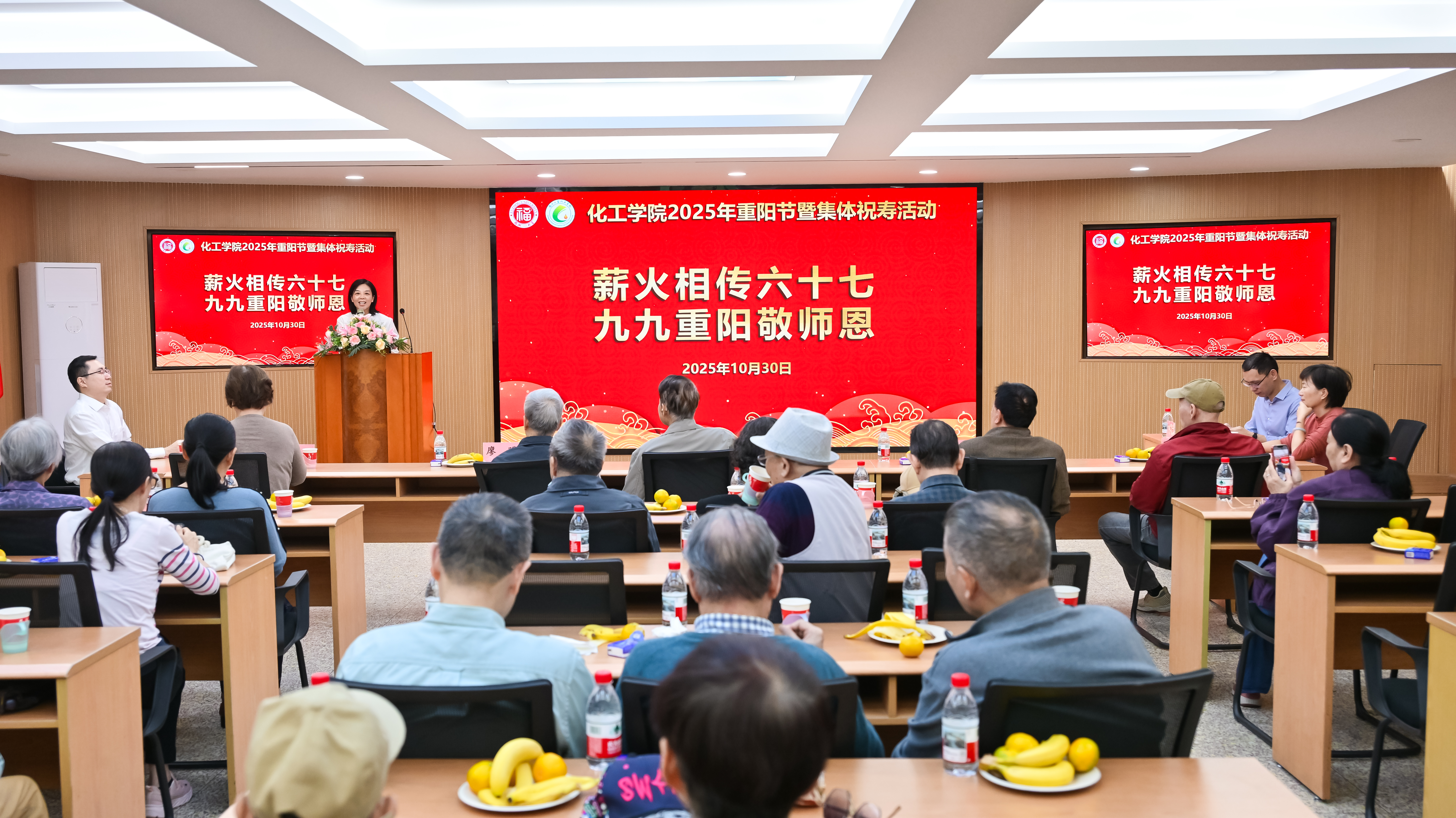 岁岁重阳,今又重阳。为大力弘扬孝亲敬老传统美德,进一步增强退休教职工的归属感和幸福感,共享学院事业发展成果。10月30日,化工学院隆重举办“薪火相传六十七 九九重阳敬师恩”重阳节系列活动,与老同志们共度温馨佳节。院党委书记林航、催化中心副主任张向宁、工会主席黄云云出席本次活动并深入退休教职工群体,亲切交谈、关切关心,感恩奉献、送上祝福。