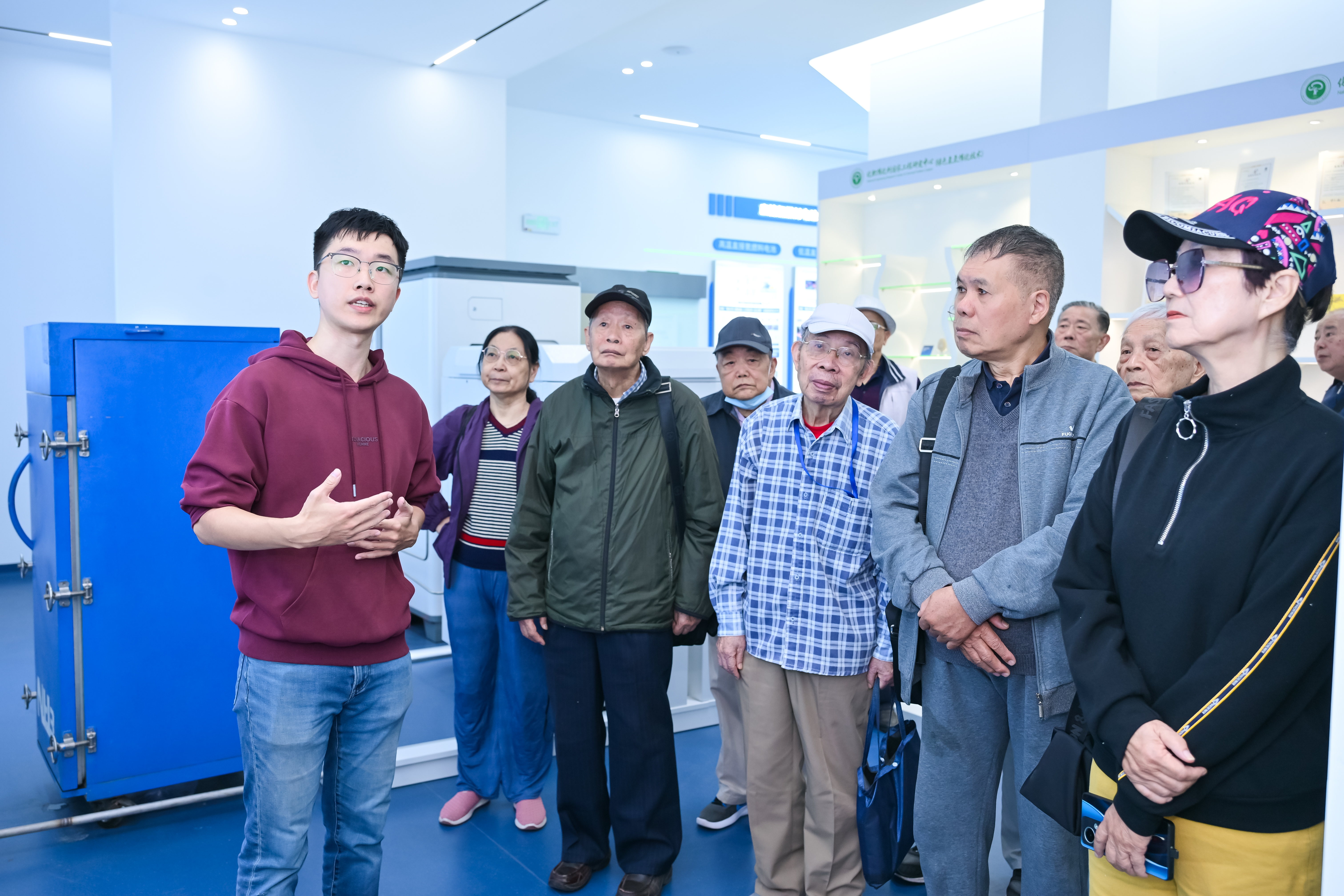 祝寿会结束,老教师们一起走进催化中心三号楼展厅进行参观,全神贯注,认真听取青年教师蔡熙阳副教授对催化中心参与氨氢能源产业发展的介绍。他们不时驻足观看,或轻声交流探讨,或仔细端详展品,深入了解产业最新的科研动态与前沿技术。他们纷纷表示,看到学院如今的发展成就,感到无比欣慰与骄傲。同时,他们也希望学院能够继续保持这种良好的发展势头,不断创新突破,为国家培养更多优秀的化工人才。