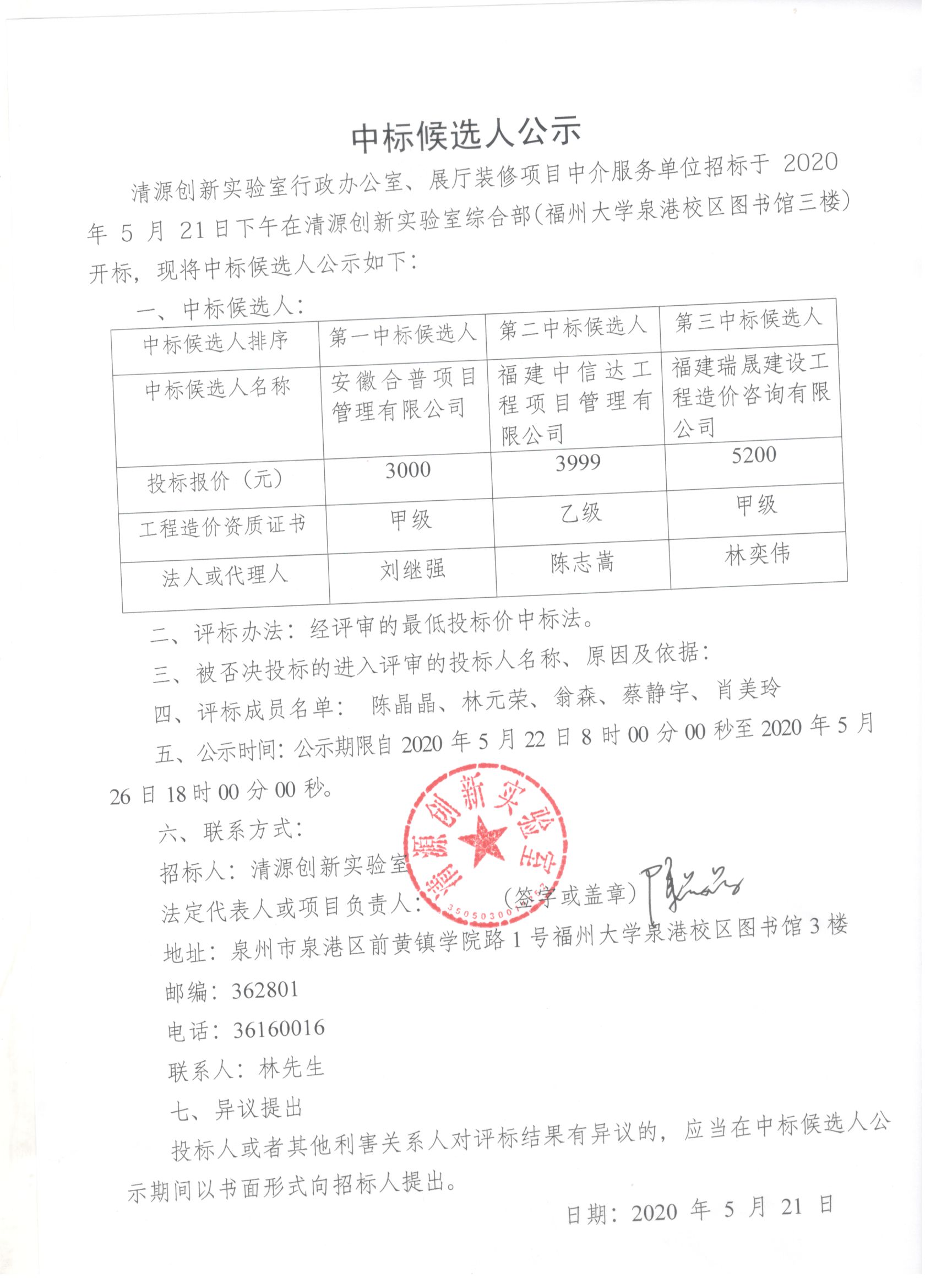 石油化工学院受清源创新实验室委托,于学院网站发布《关于清源创新实验室行政办公室、展厅装修项目中介服务单位招标中标候选人公示》,公示结果由清源创新实验室全权负责解释。