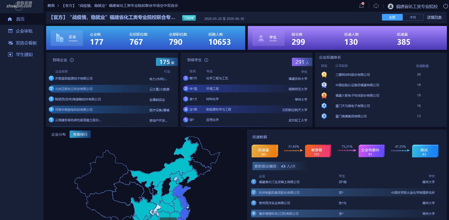 石油化工学院率先联合智联招聘网启动空中双选会,牵头开展福建省化工行业八校联合专场空中宣讲会,保障疫情期间毕业生就业不掉线。