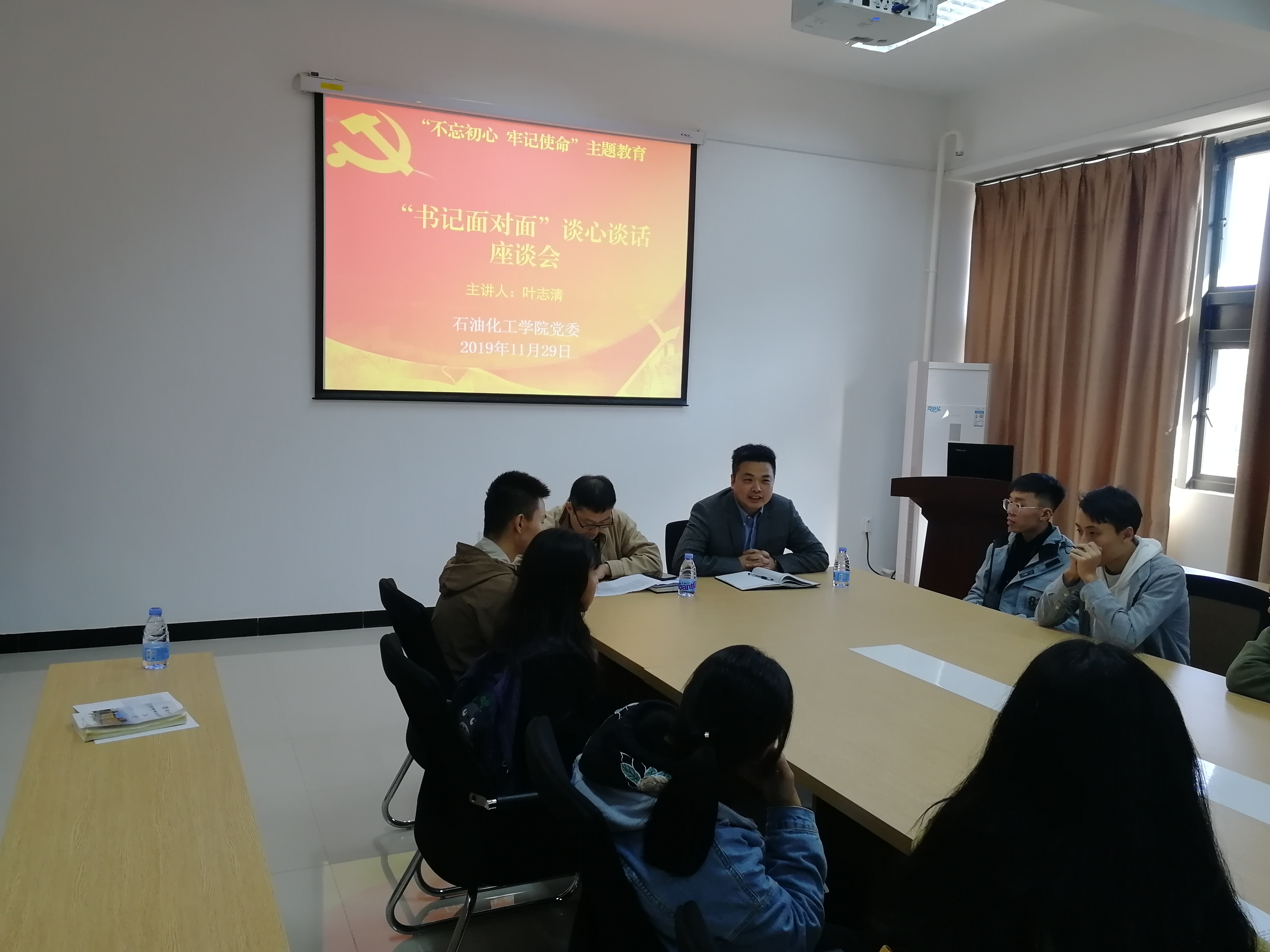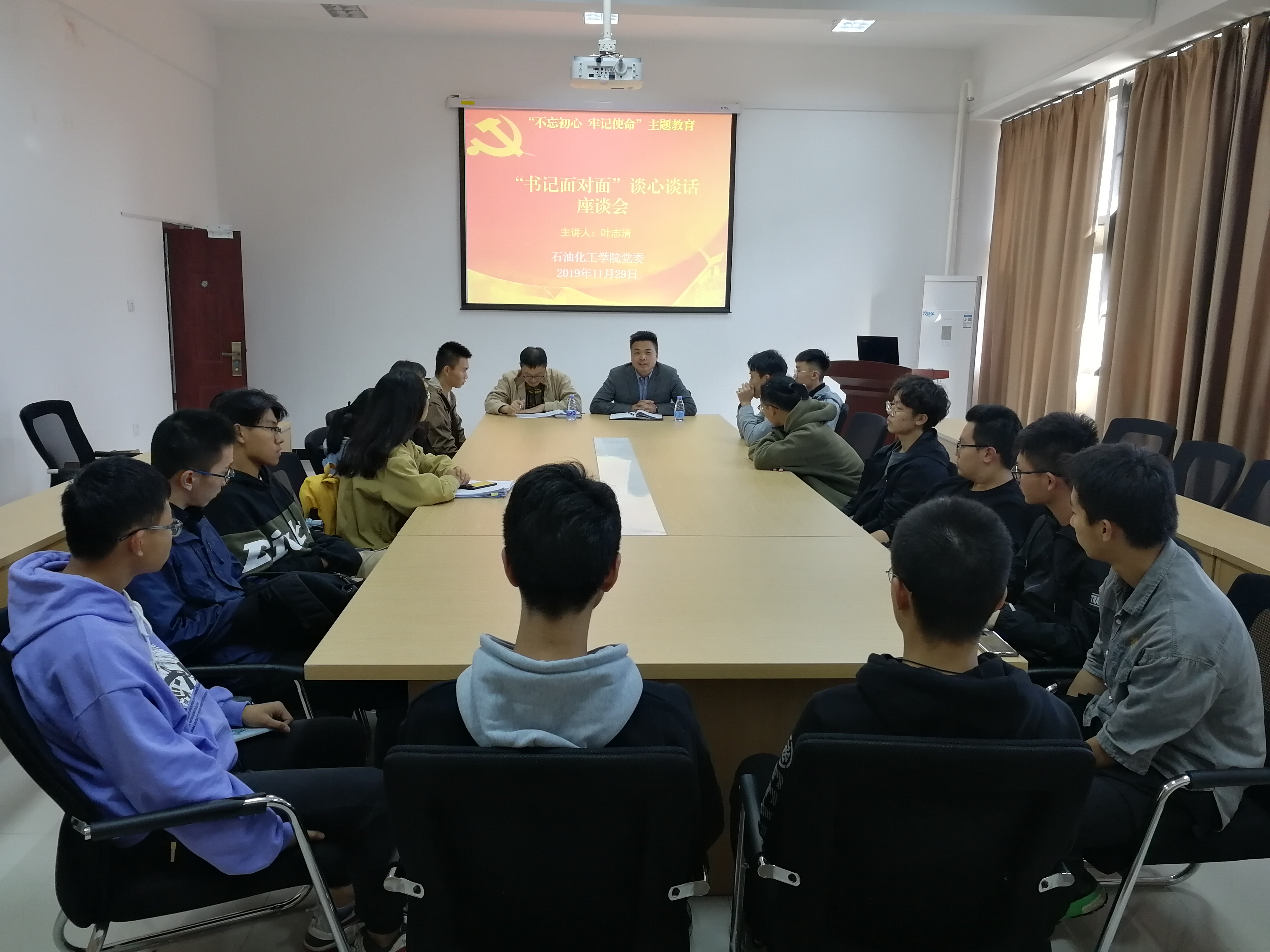 在泉港楼411会议室成功举办“不忘初心、牢记使命”主题教育“书记面对面”谈心谈话座谈会。参加本次座谈会的有院党委书记叶志清副教授、全球高被引科学家赖跃坤教授、2019级辅导员林泉富老师及2019级过控一班部分学生。