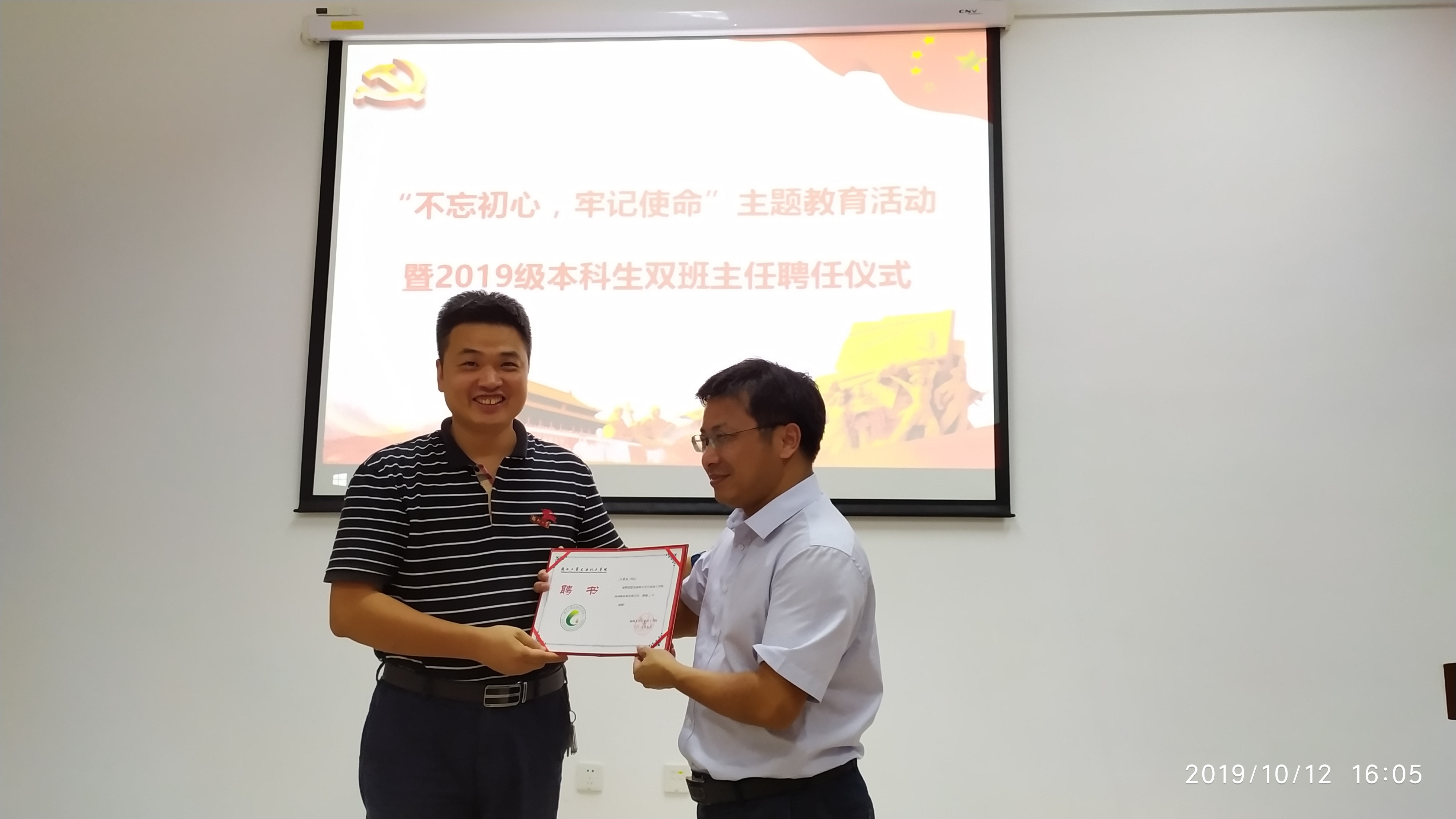 在泉港楼411会议室召开“不忘初心、牢记使命”主题教育暨2019级本科生双班主任聘任仪式,会议由党委副书记岳志强副教授主持,学院主要领导及受聘班主任参加本次会议。