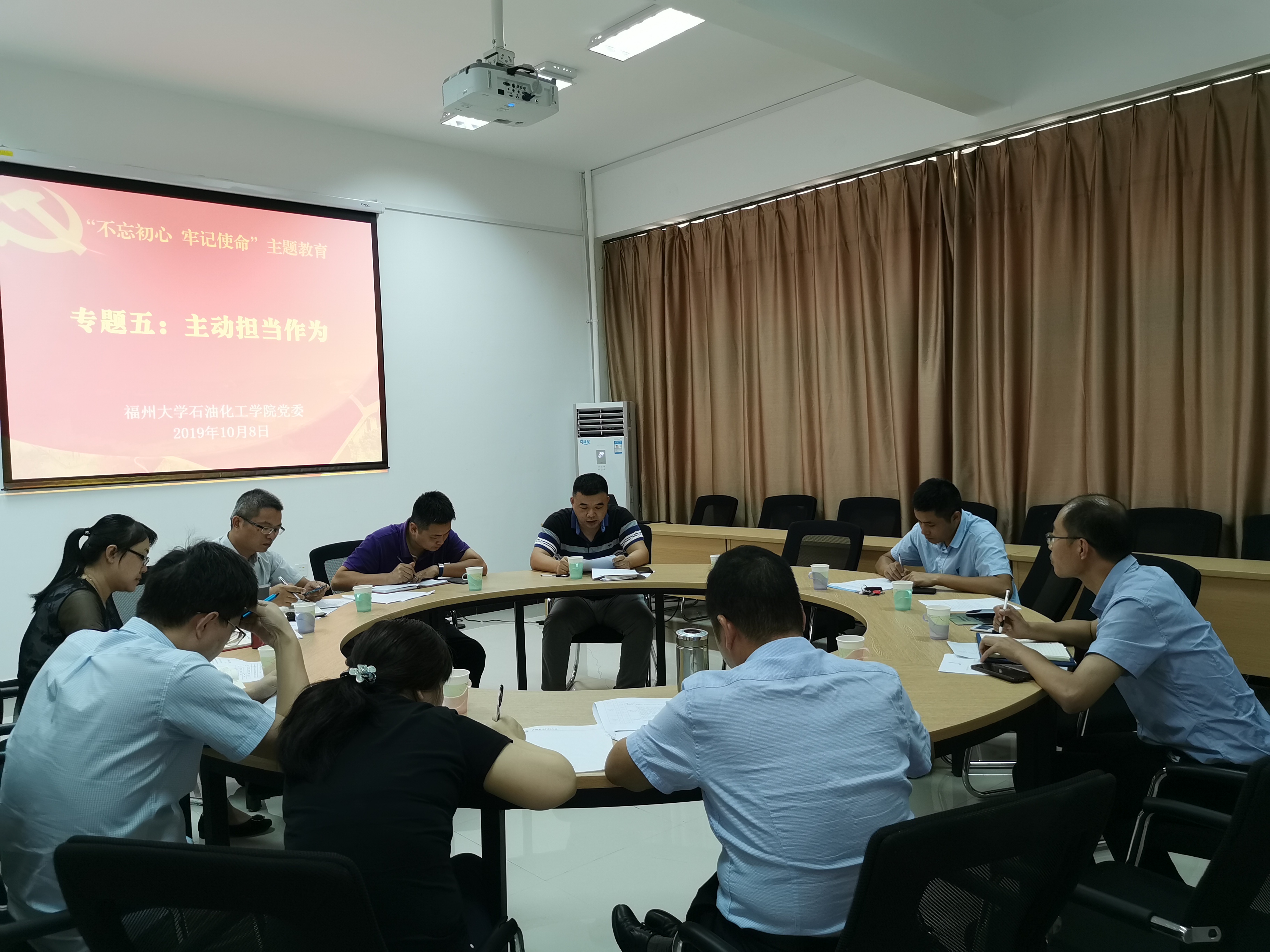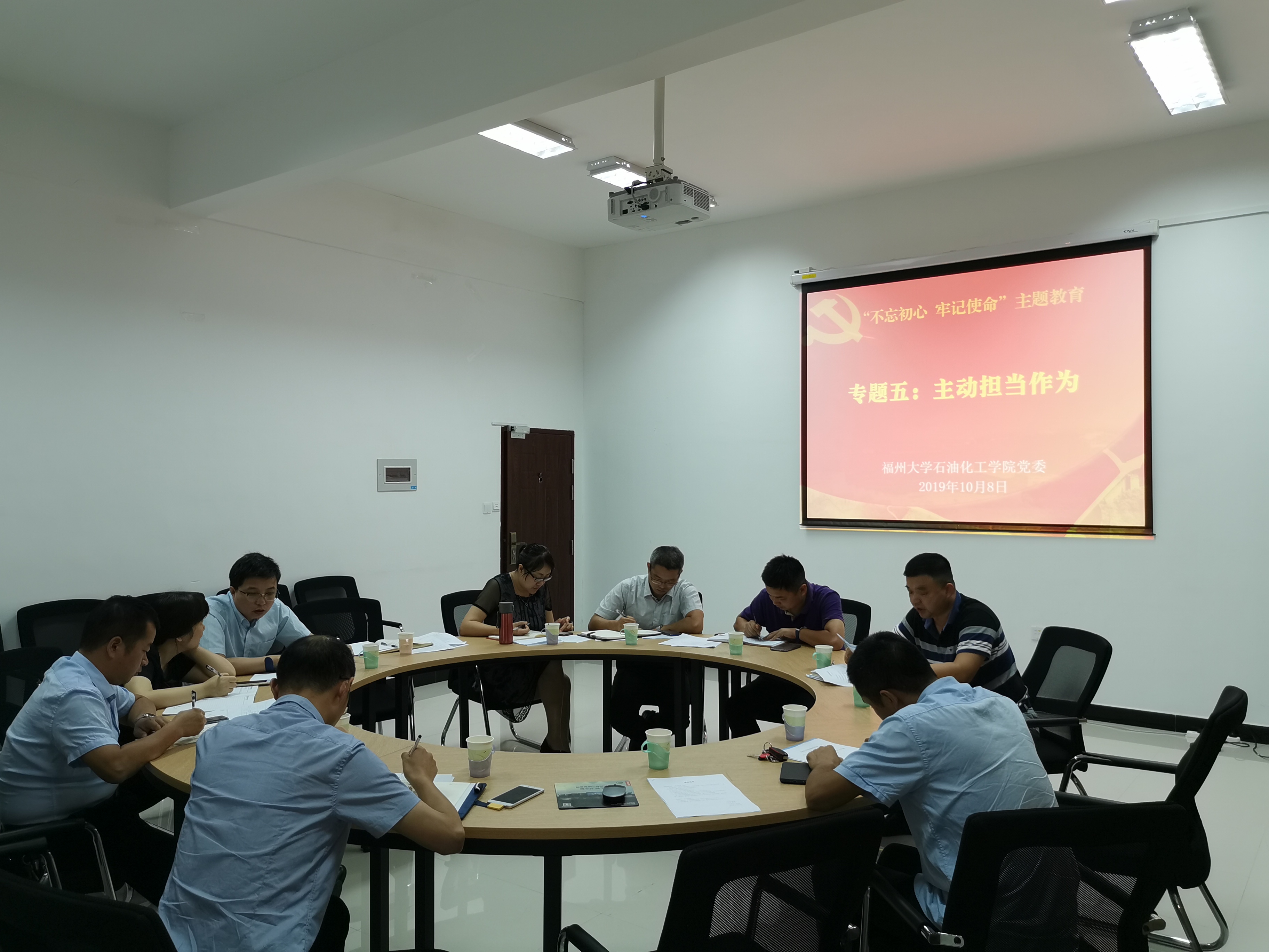 2019年10月8日下午,石油化工学院根据“不忘初心、牢记使命”主题教育的工作安排,组织开展“主动担当作为”专题集中学习活动,学院副处级以上领导干部(含校聘)、党委委员参加本次集中学习活动。
